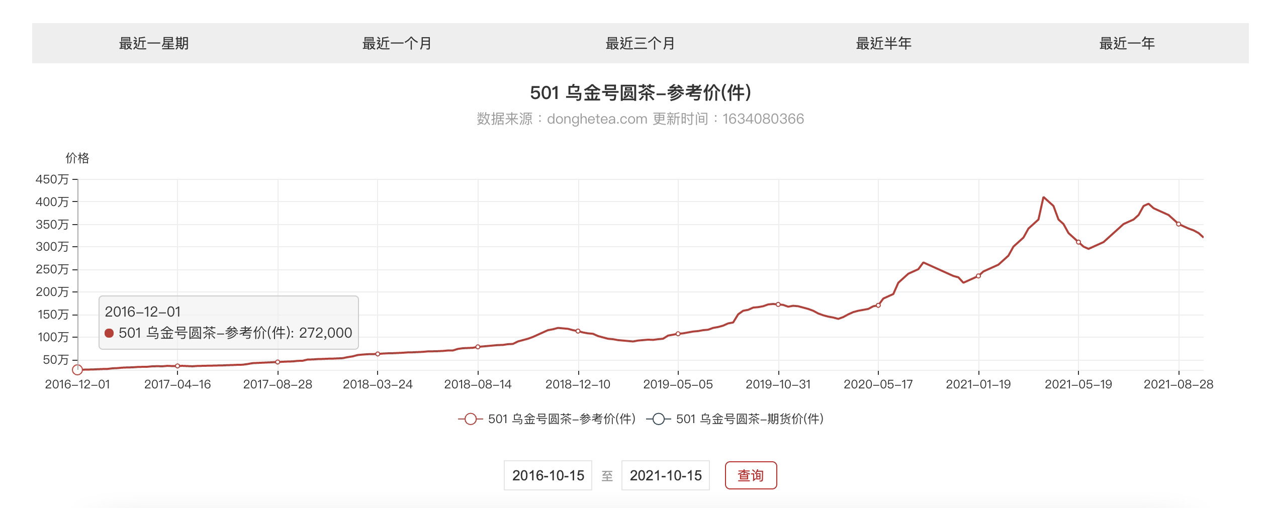 以東和茶葉行情網報價,2016年底價格為RMB¥272,000/件,經過將近五年的時間2021/10/15為RMB¥3,200,000/件。